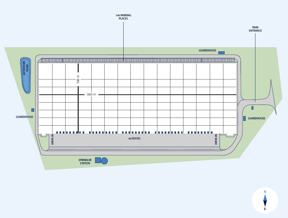 Planned construction of one 39,000 sq m hall, designed with 10 m clear height with LED lighting and BREEAM Excellent certification. The hall will be suitable for manufacturing, warehousing and distribution.