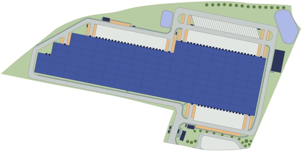 Planned construction of a modern industrial building with a total area of 37,000 sq m. The building is designed with a clear height of 10.5 m, but this can be increased up to 14 m, and it will feature direct drive-in access or loading docks, sprinklers, LED lighting, charging stations for electric vehicles, and solar panels. The building is aiming for BREEAM Excellent certification. The premises will be suitable for warehousing, logistics, distribution, or light production.