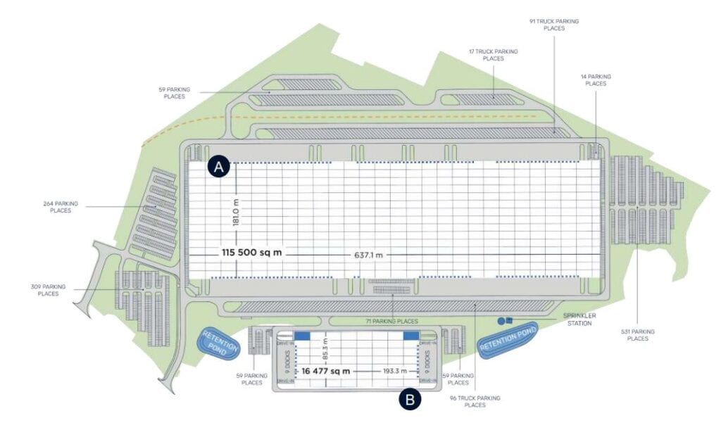 Plánovaná výstavba dvou průmyslových hal o celkové pronajímatelné ploše 130 000 m2. Budovy budou disponovat nakládacími rampami i přímými vjezdy. Budovy jsou navrženy s nadstandardní světlou výškou až 18 m a po dokončení obdrží certifikaci na úrovni BREEAM Excellent. Nejmenší pronajímatelná jednotka je zhruba 15 000 m2. K hale je možno přivést železniční vlečku. Prostory budou vhodné pro skladování, e-commerce, maloobchod nebo logistiku. Možnost výstavby prostor na míru dle vlastní specifikace.