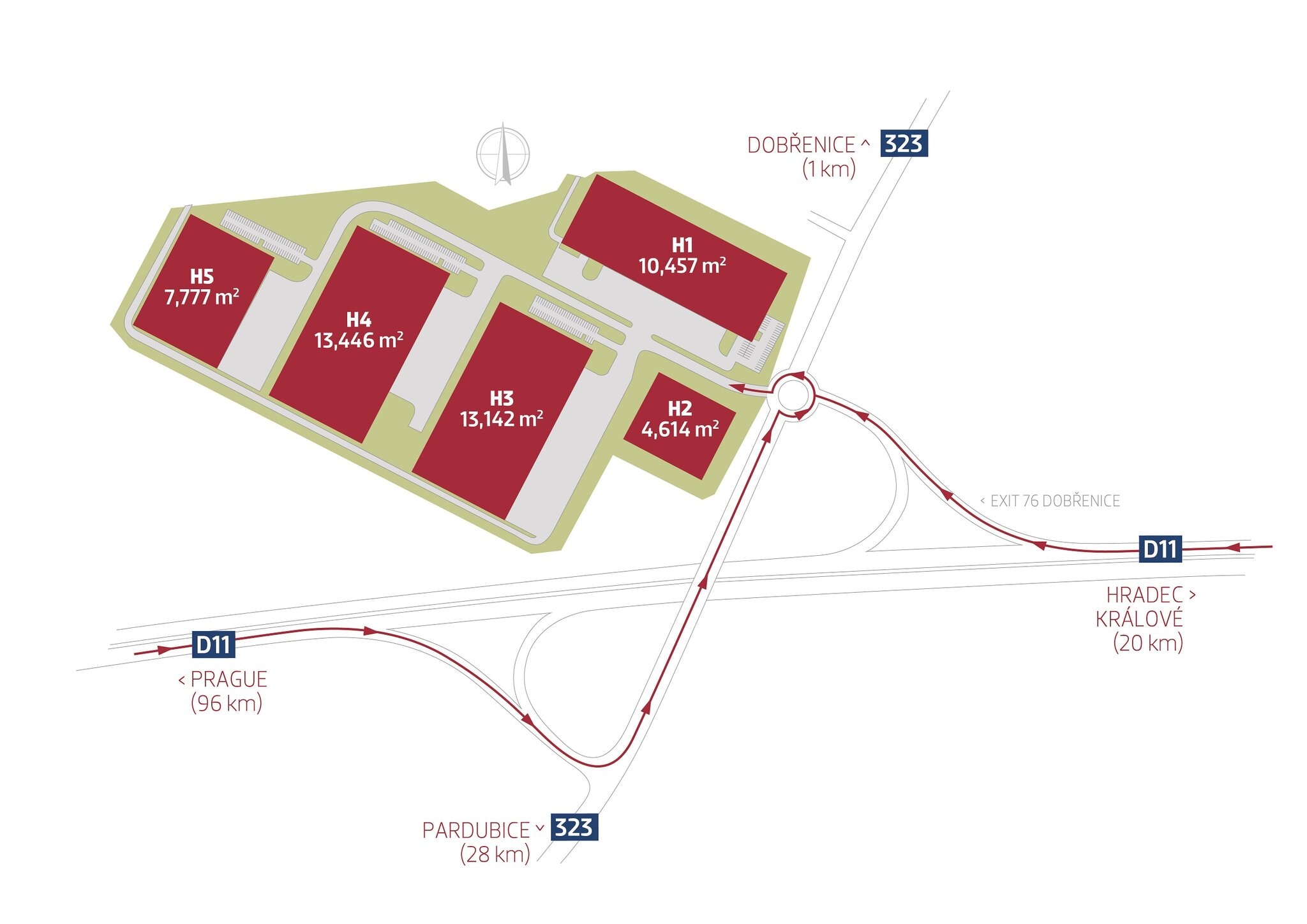 Areál se nachází v obci Dobřenice, blízko Hradce Králové (15 km). přímo u exitu č. 76 na dálnici D11 (Praha - Hradec Králové). Autobusová zastávka leží v dochozí vzdálenosti.
