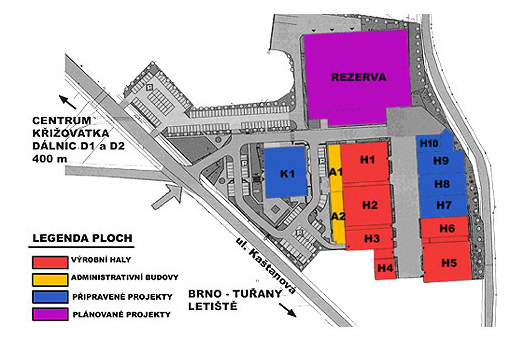 Areál leží v jižní části Brna. V blízkosti exitu č. 196 na dálnici D1, který také nabízí přímé spojení na dálnici D2. Snadná dostupnost městskou hromadnou dopravou - autobusová zastávka v dochozí vzdálenosti.