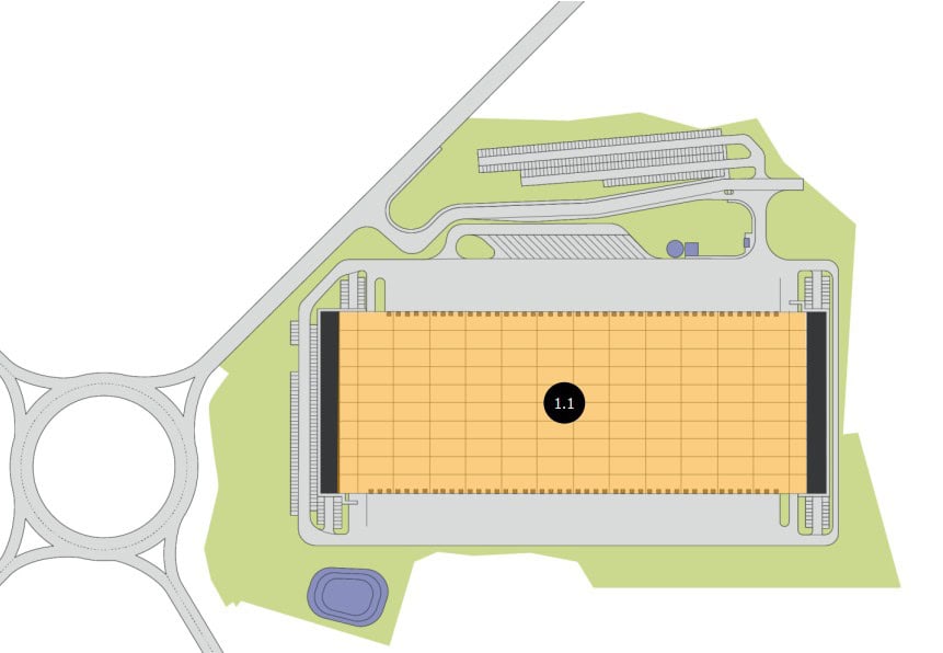 Plánovaná výstavba jedné průmyslové haly o velikosti 40 900 m2. Budova byla navržena s nadstandardní světlou výškou až 12 m. Prostory budou vhodné pro skladování, logistiku, distribuci či lehkou výrobu. Výstavba bude realizována na míru dle požadavků budoucího nájemce. Předání prostor je možné během 9 měsíců po podpisu Smlouvy o smlouvě budoucí nájemní.