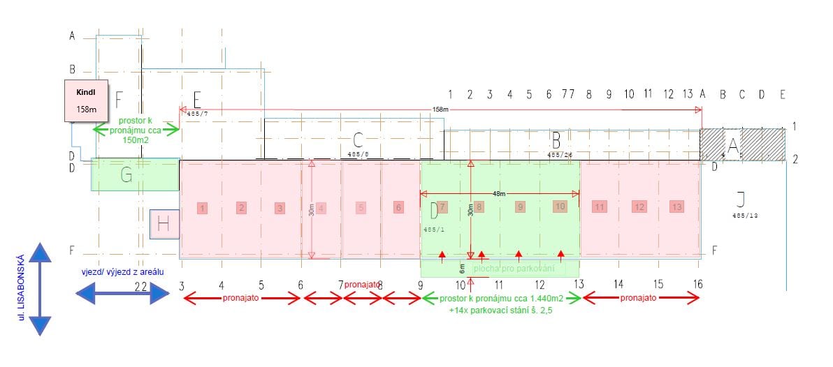 Starší průmyslová hala B-C class o celkové velikosti 4680 m2. Hala může být rozdělena na menší jednotky. Nejmenší pronajímatelná plocha je 360 m2. Čistá výška haly je cca 15 m. Rampy nejsou k dispozici. Součástí areálu jsou další budovy s administrativními prostory. Kanceláře nejsou přímo propojené se sklady, ale jsou rovněž k dispozici k pronájmu. Prostory jsou vhodné na skladování a distribuci.