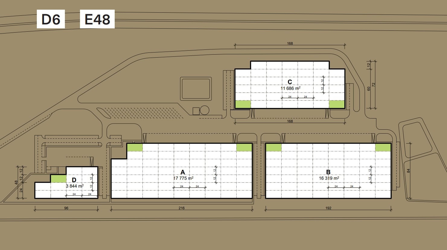 Areál tvoří čtyři průmyslové haly různých velikostí, které dohromady nabízí pronajímatelnou plochu téměř 70 000 m2. Prostory jsou vhodné pro skladování, logistiku, distribuci či lehkou výrobu. Další výstavba v tomto areálu již není možná.