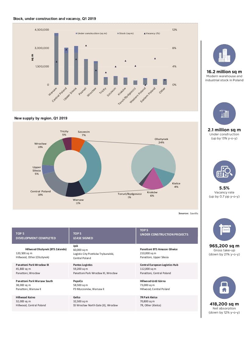 • Warehouse and industrial market in Poland in Q1 2019 continues dynamic development. Due to low unemployment on the main markets, new locations keep emerging. Projects dedicated for urban logistics are on the rise.